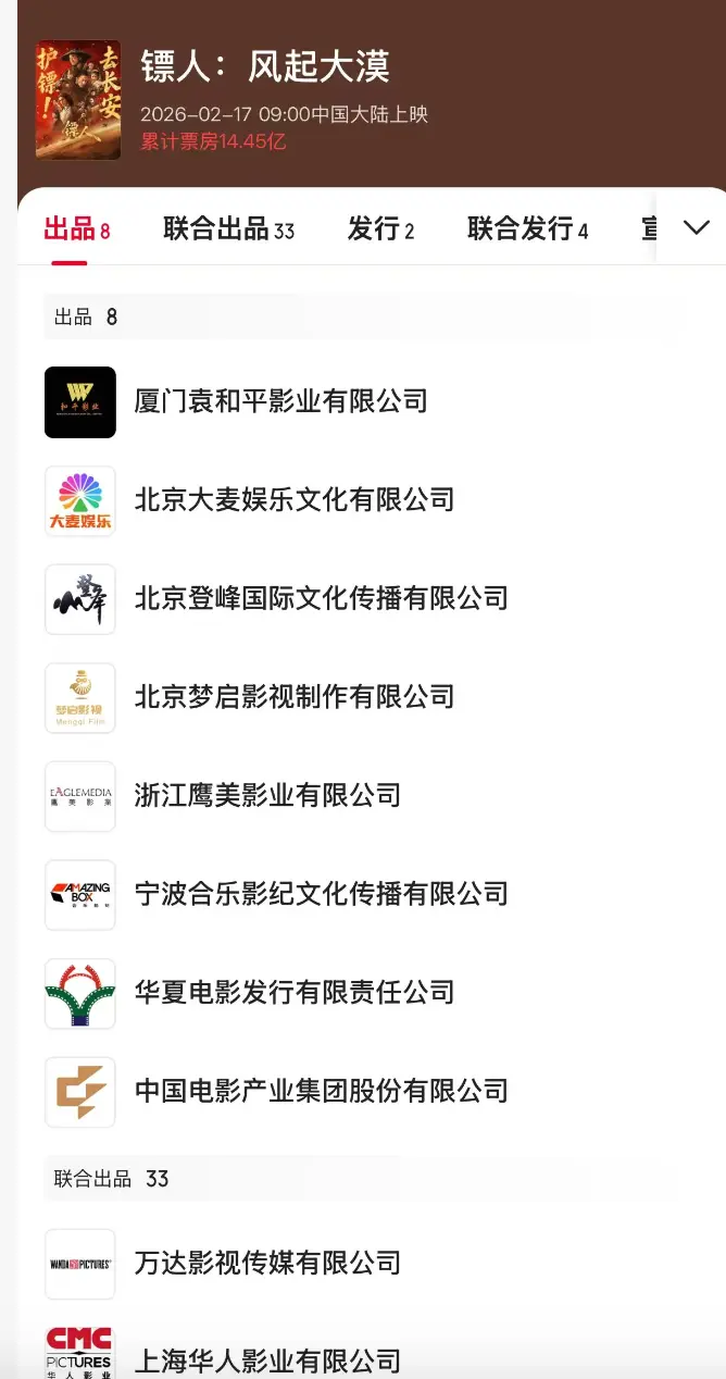 但排在第一的是袁和平的公司,第二名是大麦娱乐,排在第三名的就是吴京的登峰国际了。